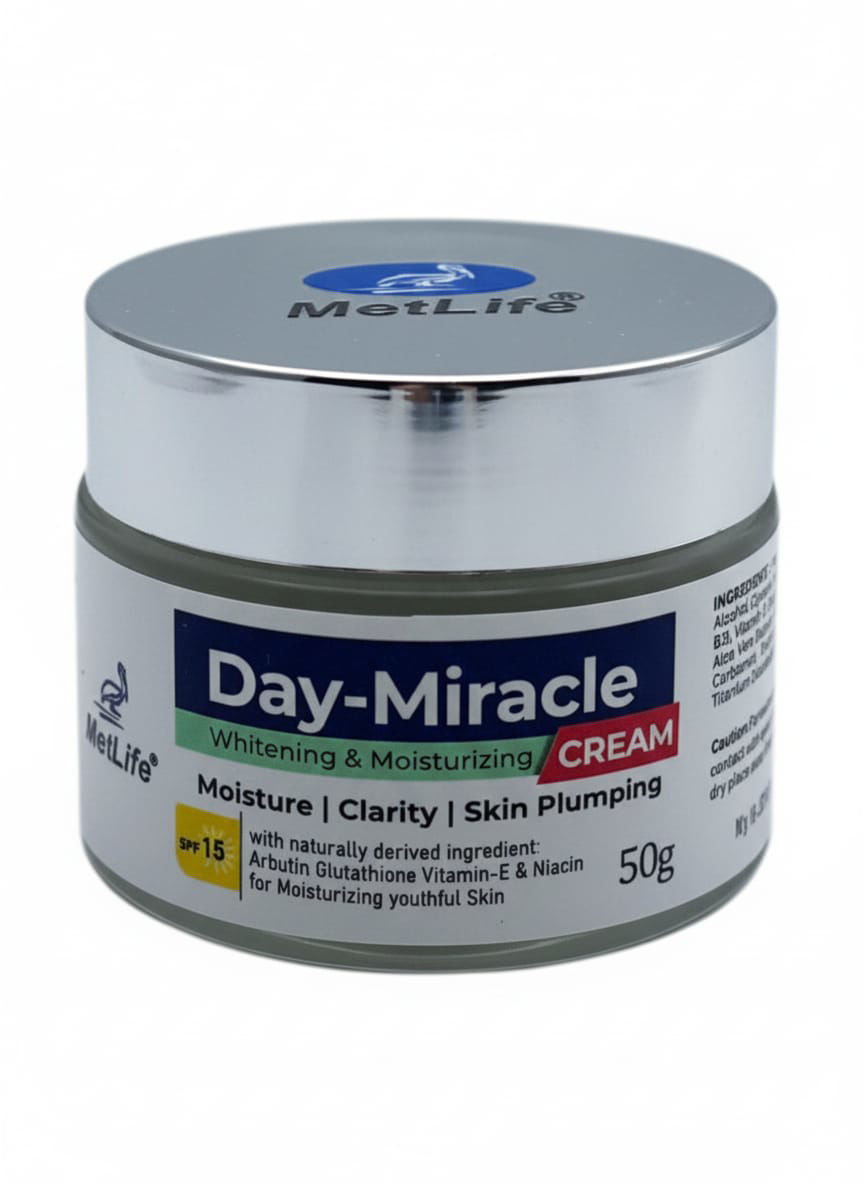 Day-Miracle Whitening & Moisturizing Cream is a premium skincare solution designed to brighten, hydrate, and revitalize your skin throughout the day. Formulated with Arbutin, Glutathione, and Vitamin E, this cream works to even out skin tone, reduce dullness, and protect against daily environmental stressors. Its advanced moisturizing properties ensure your skin stays soft, supple, and plump, while promoting a healthy, radiant glow. Ideal for daily use, Day-Miracle Cream combines whitening, hydration, and skin-plumping benefits in a single luxurious formula.